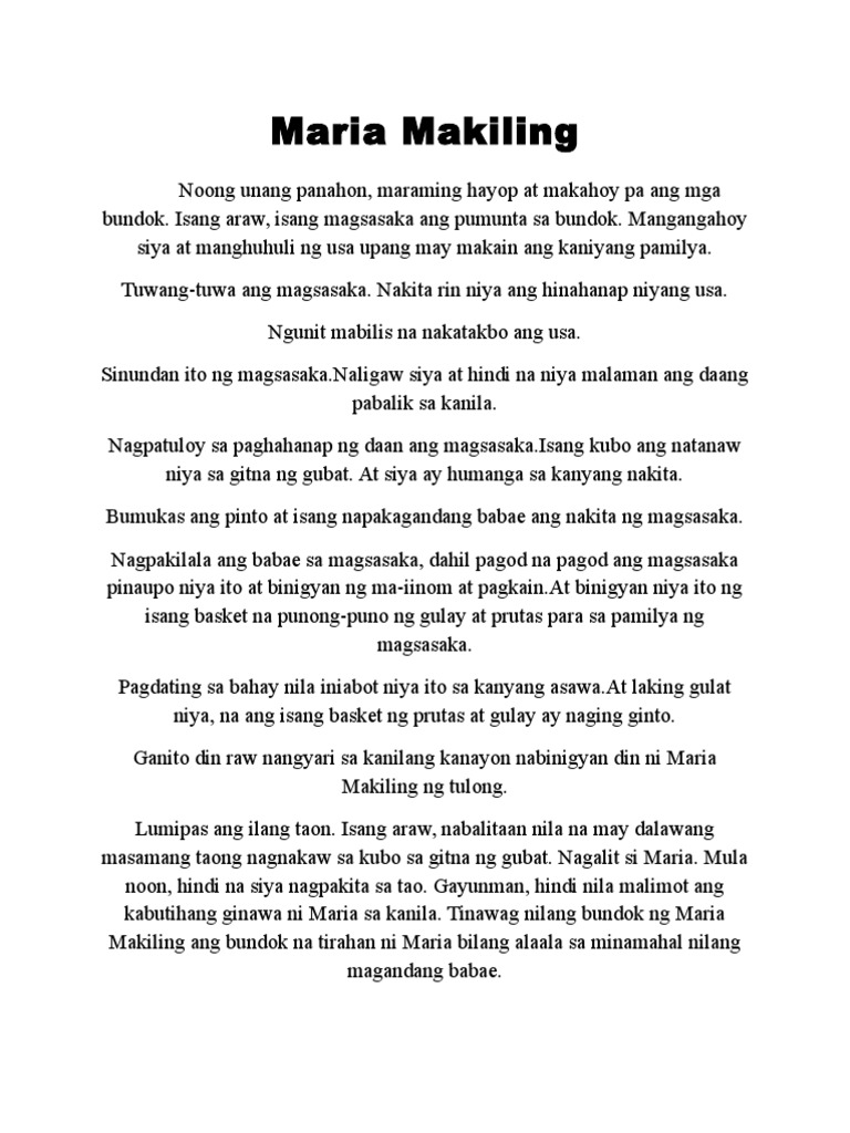 Alamat ni Maria Makiling. Alamat at kuwento sa paligid ng Bundok Makiling ni Oikoy. Kakaiba ang kanyang mga katangian dahil siya ay mabait mapagbigay matulungin at magalang.