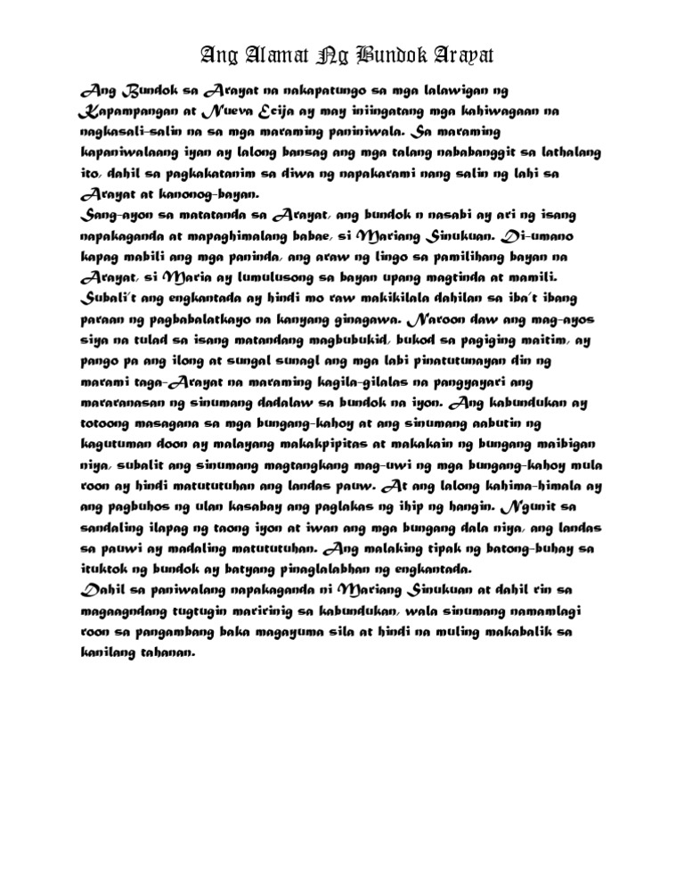 Alamat ng Bundok Arayat Ang Bundok sa Arayat na nakapatungo sa mga lalawigan ng Kapampangan at Nueva Ecija ay may iniingatang mga kahiwagaan na nagkasali-salin na sa mga maraming paniniwala. Kilala siya doon bilang Mariang Sinukuan. Ang kwento ng mga taong naninirahan sa pamayanan doon si Maria raw isang magandang babaeng diwata may mahaba at kulot itong buhok na umaabot hanggang sa.