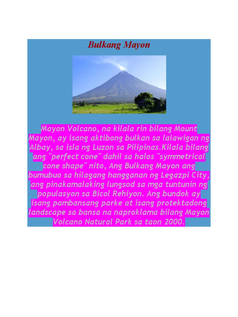 2ito ay matatagpuan sa albay. Saang lugar matatagpuan ang mayon volcano. Inihahambing ito sa Bundok Fuji ng bansang Hapon dahil sa tila perpekto nitong hugis.